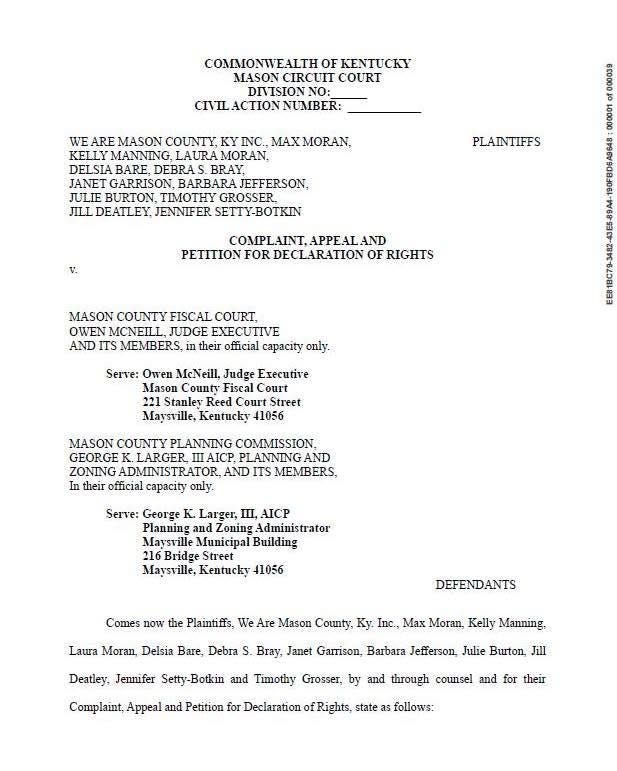 According to a report by Local 12 The group ‘We Are Mason County, Ky. Inc’., along with individual plaintiffs including Max Moran, Kelly Manning, Laura Moran, Delsia Bare, Debra S. Bray, Janet Garrison, Barbara Jefferson, Julie Burton, Timothy Grosser, Jill Deatley, and Jennifer Setty-Botkin, filed a Complaint, Appeal and Petition for Declaration of Rights with the Mason Circuit Court (Civil Division). The lawsuit names Mason County Fiscal Court, Judge Executive Owen McNeill, the Mason County Planning Commission, Planning and Zoning Administrator George K. Larger, III, AICP, and their members in their official capacities as defendants.