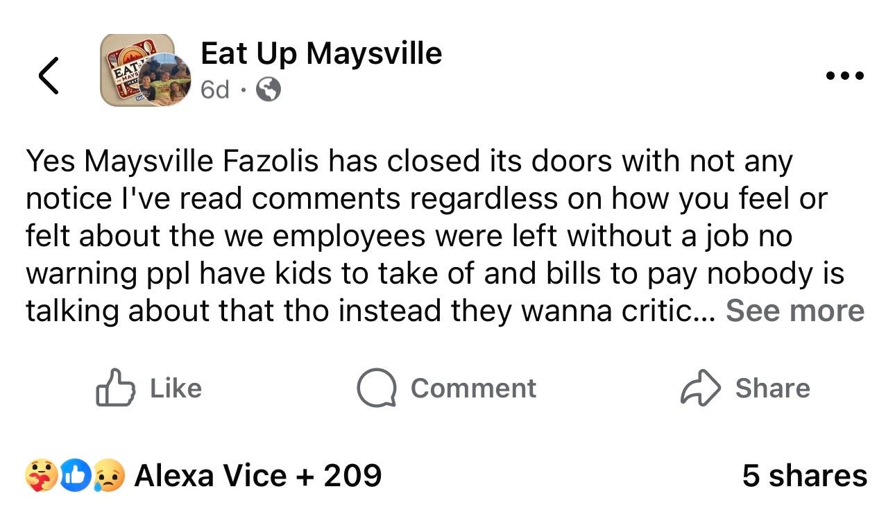 “Yes Maysville Fazolis has closed its doors with not any notice I’ve read comments regardless on how you feel or felt about the we employees were left without a job no warning ppl have kids to take care of and bills to pay nobody is talking about that tho instead they wanna criticize you I pray for you and my work family because I severe a God so big that I know he has a plan for me because when one door closes there is another one open”